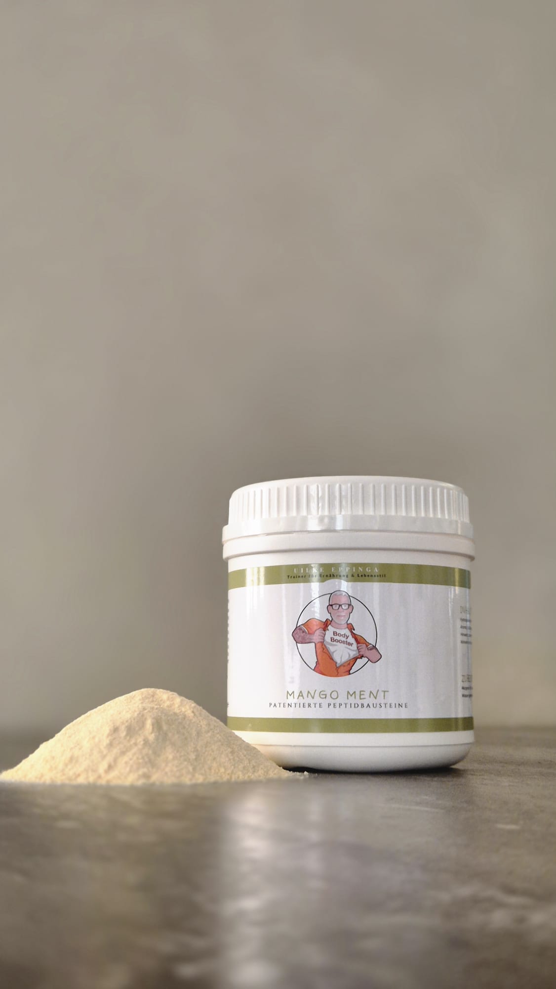 Mango Ment ist ein fermentiertes Aminosäuren-Produkt mit 20 essentiellen und nicht-essentiellen Aminosäuren. Die Nährstoffe gelangen direkt ins Blut und stehen dem Körper sofort zur Verfügung – ganz ohne Belastung des Magen-Darm-Trakts. Bereits 10 g täglich reichen in der Body Booster Zeit völlig aus. Mango Ment wird morgens zusammen mit Aloe und Vita Zell (Alternativ: Vita Aktiva) in 300 ml Wasser gemischt.