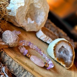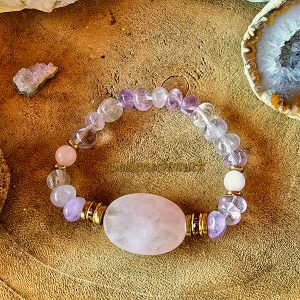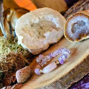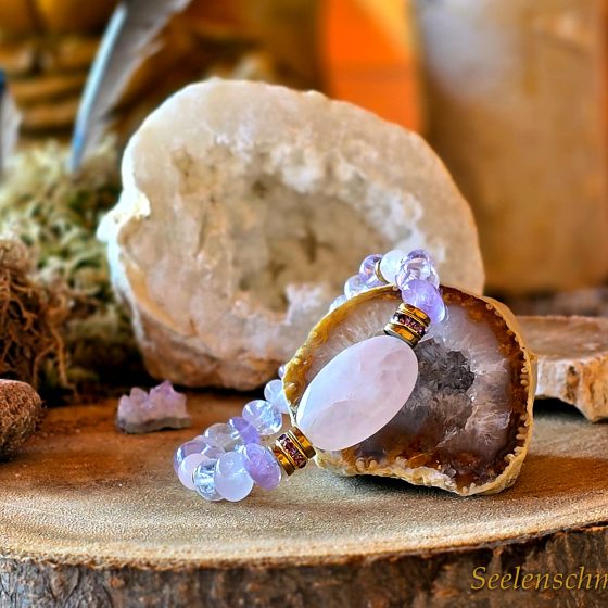 Voller Liebe und Hingabe habe ich dieses wundervolle Chakra-Armband für Dich kreiert. Gewidmet habe ich Dein besonderes Unikat Deinem Herzzentrum, wie auch Deinem Kronenchakra. Den Amethyst habe ich hier in Nuggetform, in hellen Lilatönen gewählt. Er ist Deinem 7. Energiezentrum, Deinem Kronenchakra zugewiesen, schenkt Dir inneren Frieden und reinigt Deinen Geist. Als Highlight habe ich Dir im Zentrum Deines Chakra-Armbandes ein ovales, facettiertes Element aus Rosenquarz eingearbeitet. Rechts und links zeigt sich ein Rosenquarz-Akzent. Einen zusätzlichen Eyecatcher bilden die fliederfarbenen Strassrondelle rechts und links neben dem großen Rosenquarz. Dieses harmonsiche Design findet seine Vollendung mit goldenen Hämatitelementen. Der Rosenquarz ist Deinem Herzzentrum zugewiesen, unterstützt Dich sanft auf Deinem Heilungsweg, um Dein Herz wieder zu öffnen und Dich mit der bedinungslosen Liebe zu verbinden.