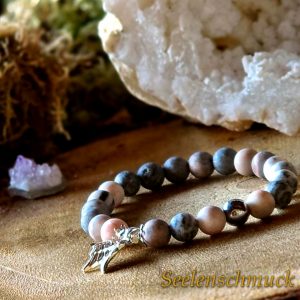 Die Farben des Zebra – Jaspis reichen von weiß über zartes Pastellrosé, bis hin zu grau und schwarz. Jede Perle ist individuell in sich gemasert und so entsteht diese perfekte Symbiose, welche Dein Armband ausstrahlt. Im Zentrum Deines Armbandes habe ich Dir einen Doppelflügel eingearbeitet. Die ersten beiden Perlen rechts und links daneben habe ich zusätzlich mit einer filigranen Perlenkappt bestückt. Als Akzent habe ich Dir an einer Seite eine Perle aus silbernen Hämatit eingearbeitet.
